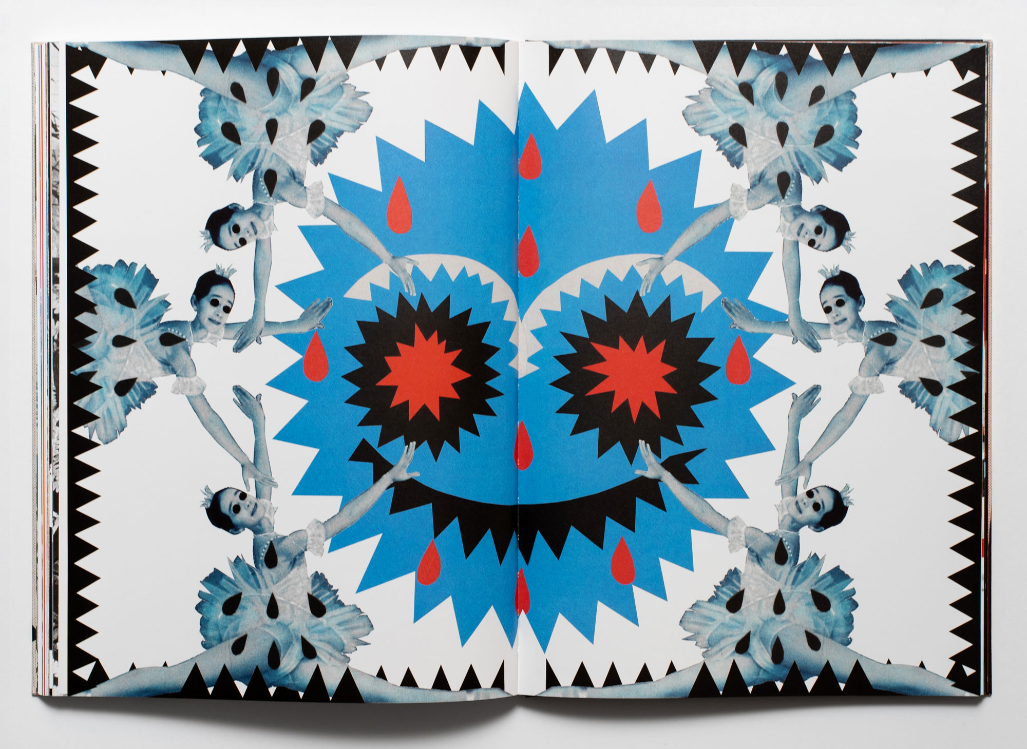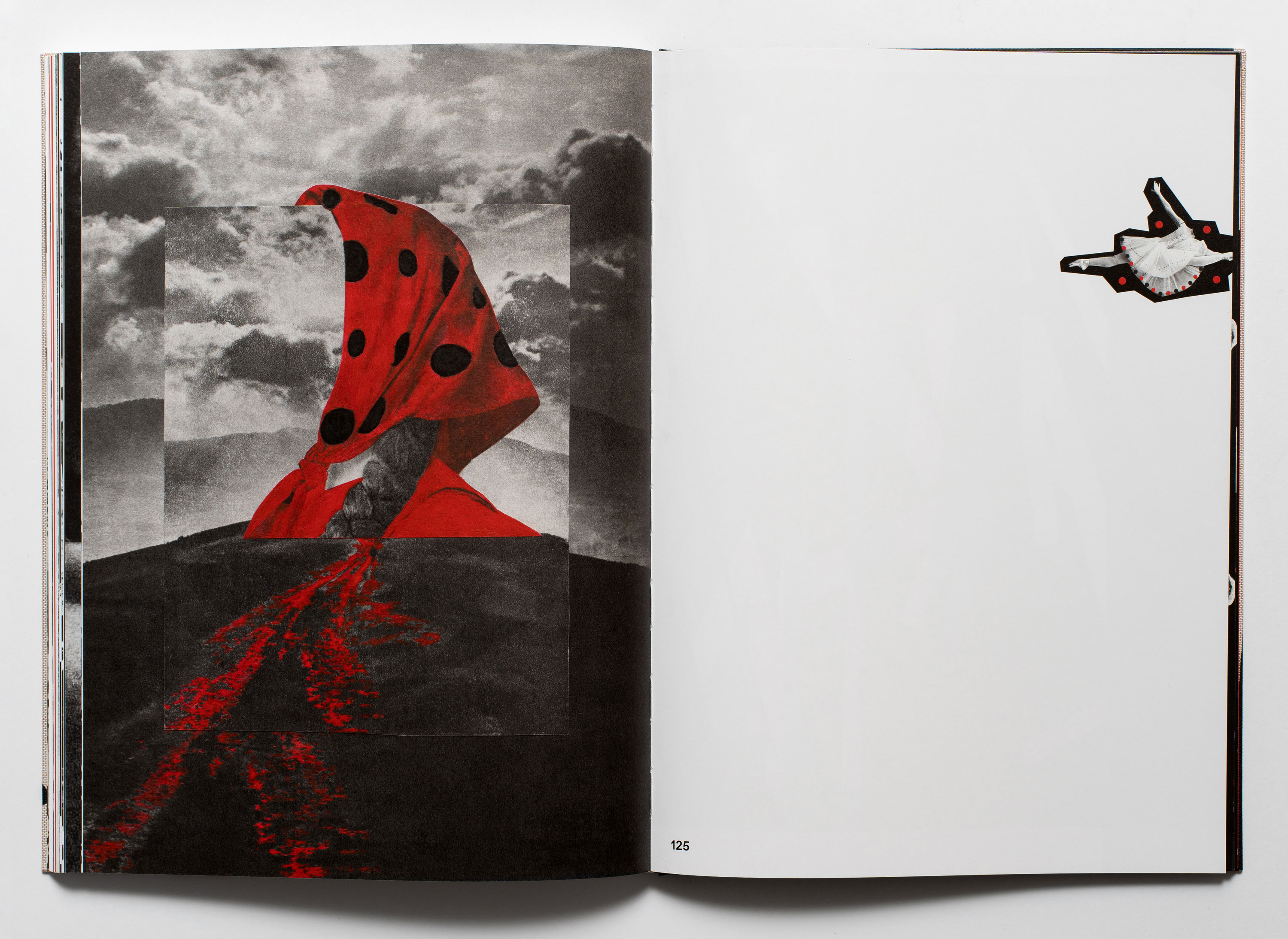 The book’s sections correspond to the series of works in chronological order, from the very first Everybody Dance! series—which gave the book its title—to the final digital collage series Coda. The latter was created specifically for the book, transforming elements drawn from one of the early works into a kaleidoscope of marching ballerinas. Section headers (Schmutztitel) are unique graphic objects made by the artist from ‘empty frames’—the last artefacts of magazine pages left after collage work. An empty frame also concludes the book as the back cover, symbolising the completion of the project and the end of this creative period.