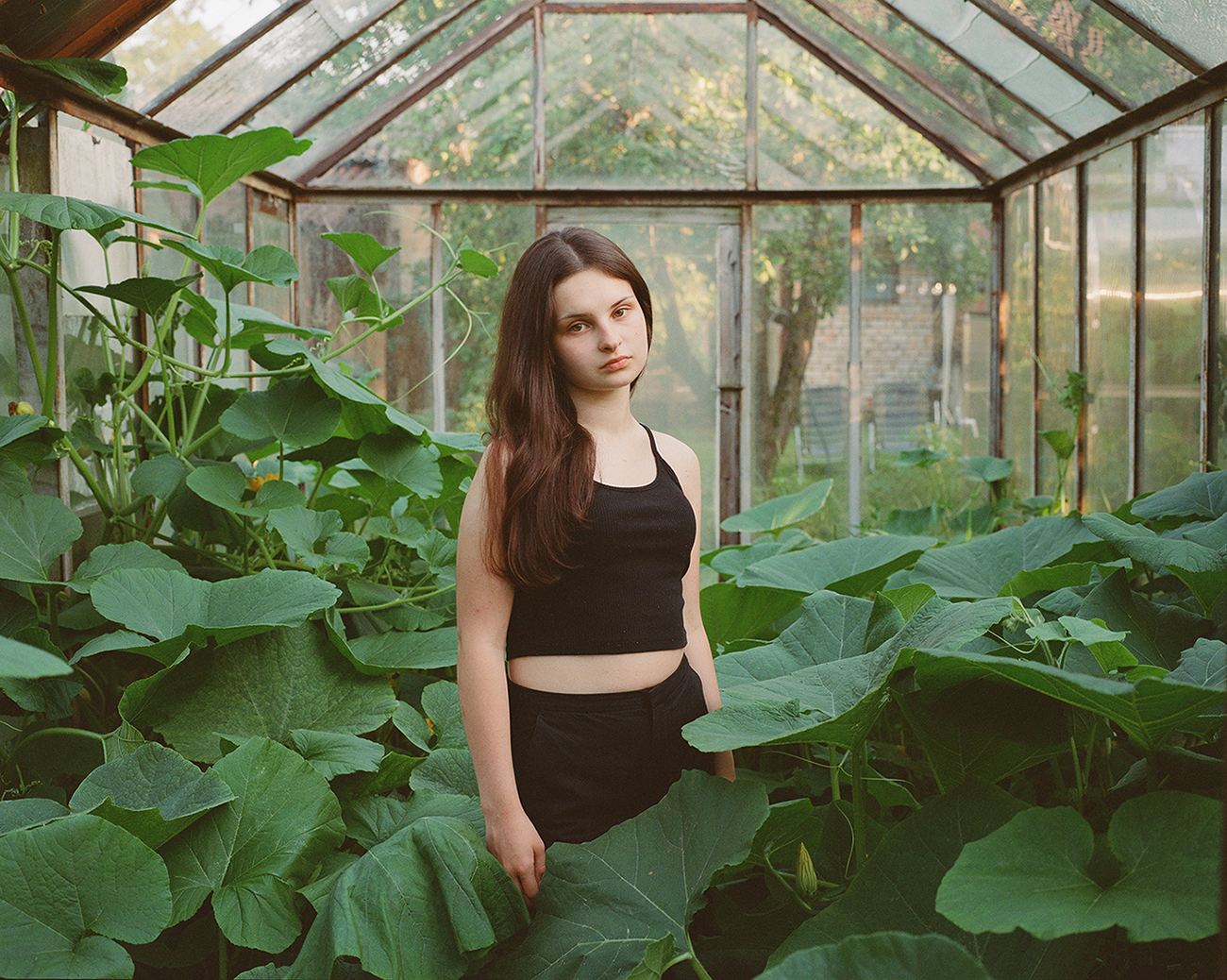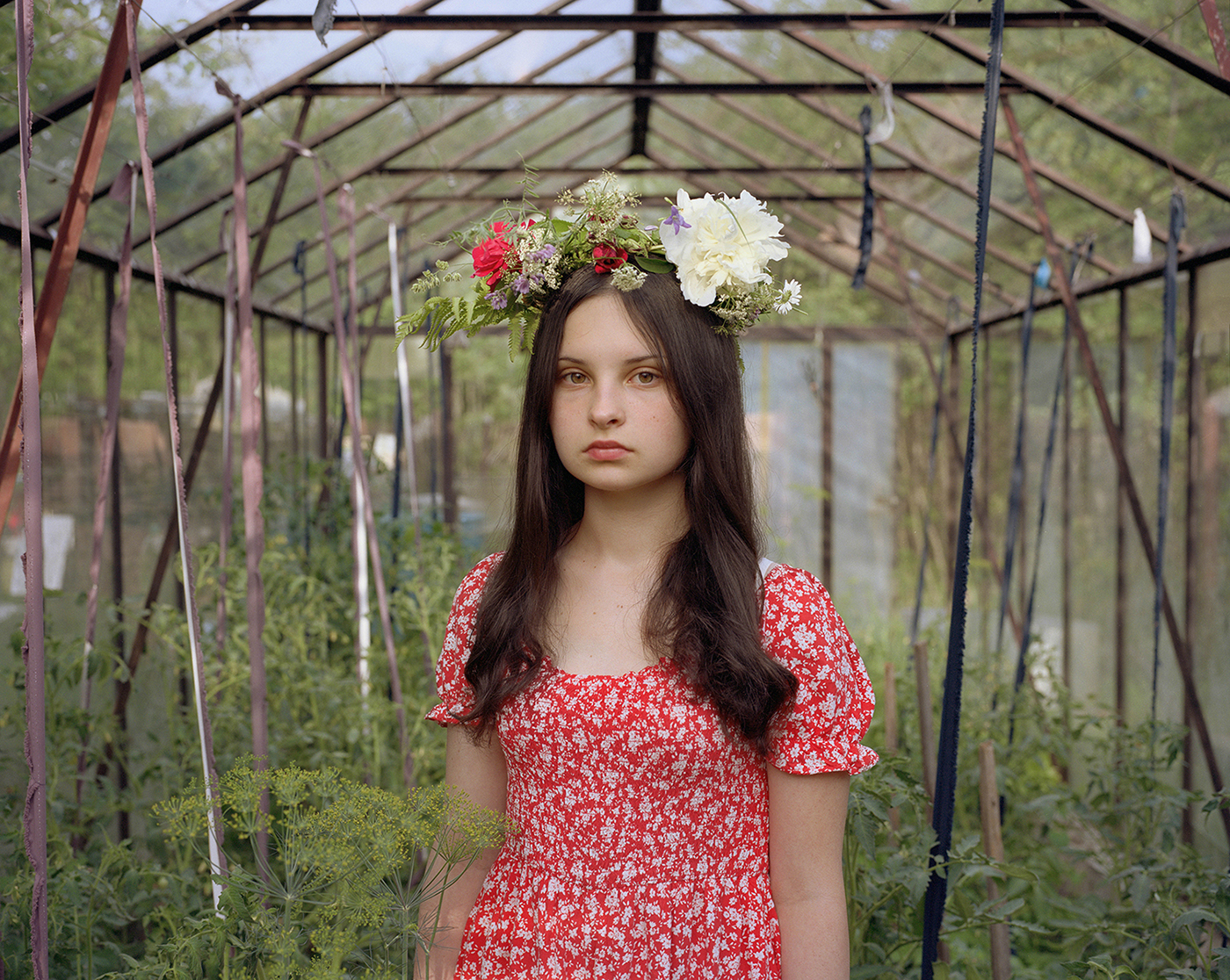 her half-sister, Elina: her father’s daughter from his second marriage. The photographs were taken at their family home in Varzas, which the artist visits every summer. Here, a greenhouse becomes an improvised photo studio, where she takes a new portrait of her sister each year.