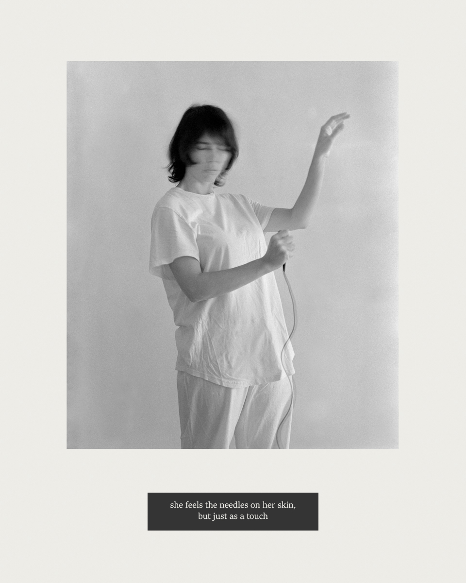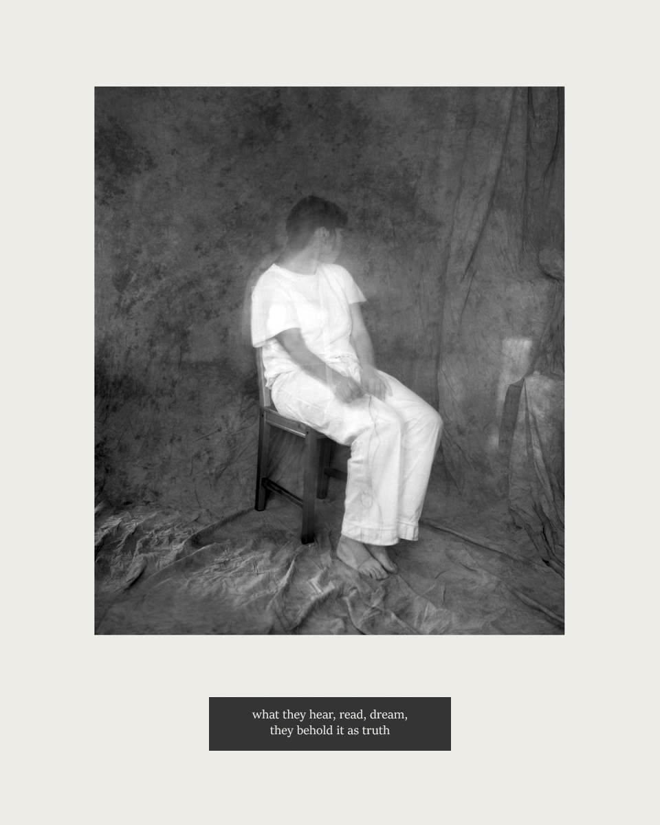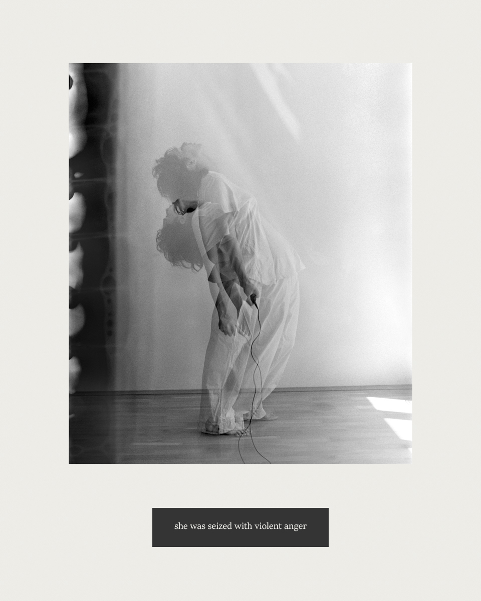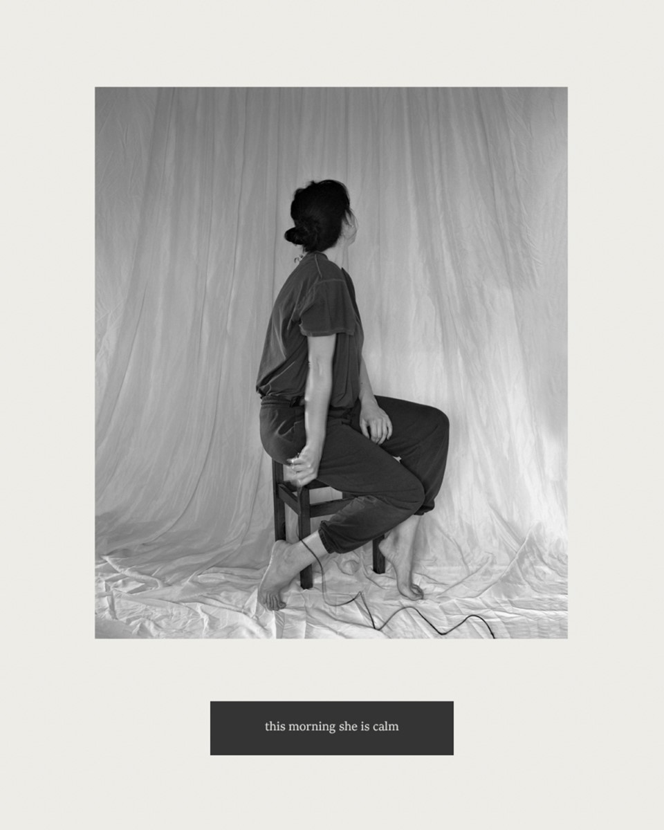 By re-enacting archival photographs, I position myself as both subject and operator of the camera, using a visible cable release to disrupt conventional hierarchies between photographer and photographed. Beneath the photographs, I inscribe excerpts from physicians’ case descriptions of photographed women.