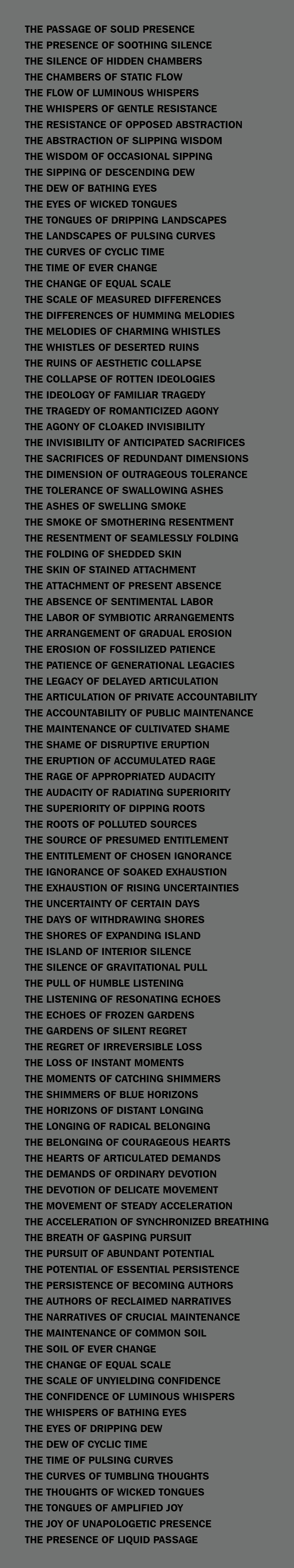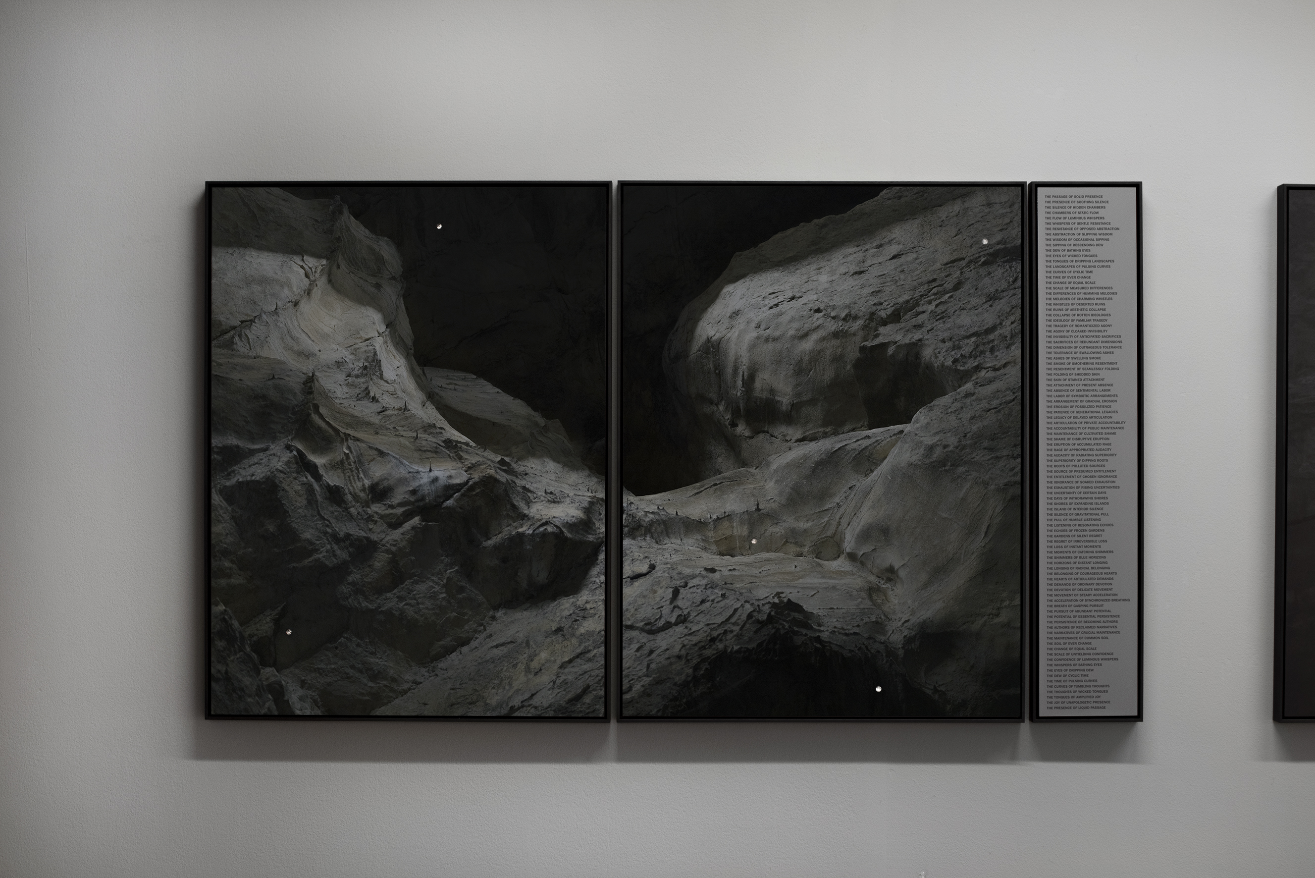"Presence of Liquid Passage, Passage of Solid Presence" draws a parallel between human transformation and the geological cycle of erosion. Drawing attention to the curves of slow spiraling, cyclical time, this image-text-based work guides us deeper into the realms of human tolerance and resilience, potential and persistence, longing and belonging, the communal and the individual, and the power to reclaim narratives. By incorporating a vocabulary related to natural phenomena into linguistic and lyrical arrangements, Vloors establishes analogies between the ambiguity of the human condition and the descending movement of water, the erosion of stone and the silence of caves, where ancient whispers of gentle resistance resonate.