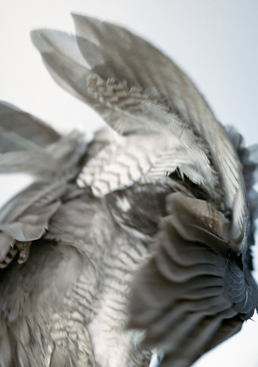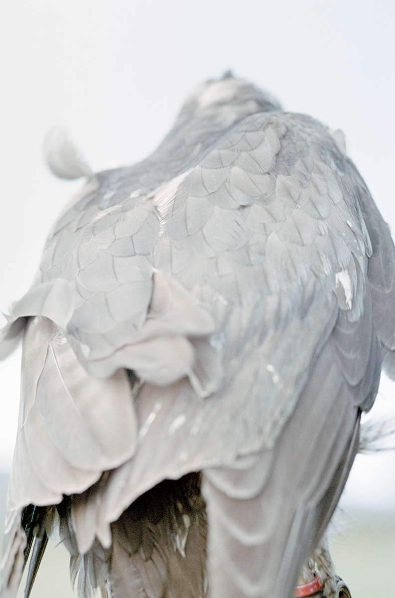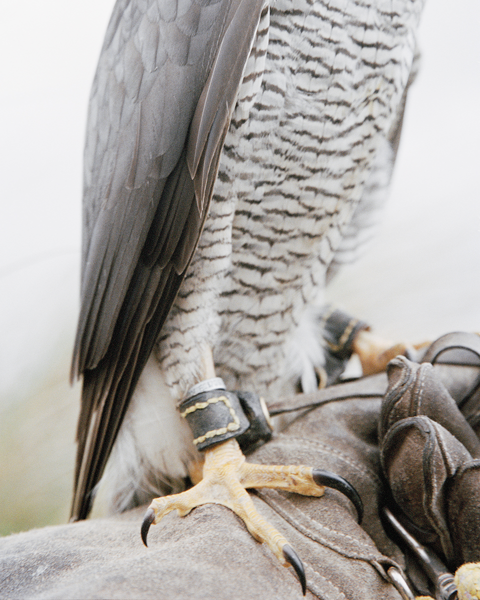 Throughout these images, a visual strategy of abstraction is adopted—the work is deliberately situated nowhere. While subtle references to the Irish landscape emerge, the birds remain geographically untethered. This ambiguity foregrounds the unknowability of the natural world: the bird is rarely fully revealed, almost never entirely present on the page. The presence of the falconer is suggested only through discreet human traces— metal anklets, handmade hoods, telemetry trackers. Inverted images further destabilise orientation, shifting the experience from passive aesthetic observation to a more critical mode of looking.