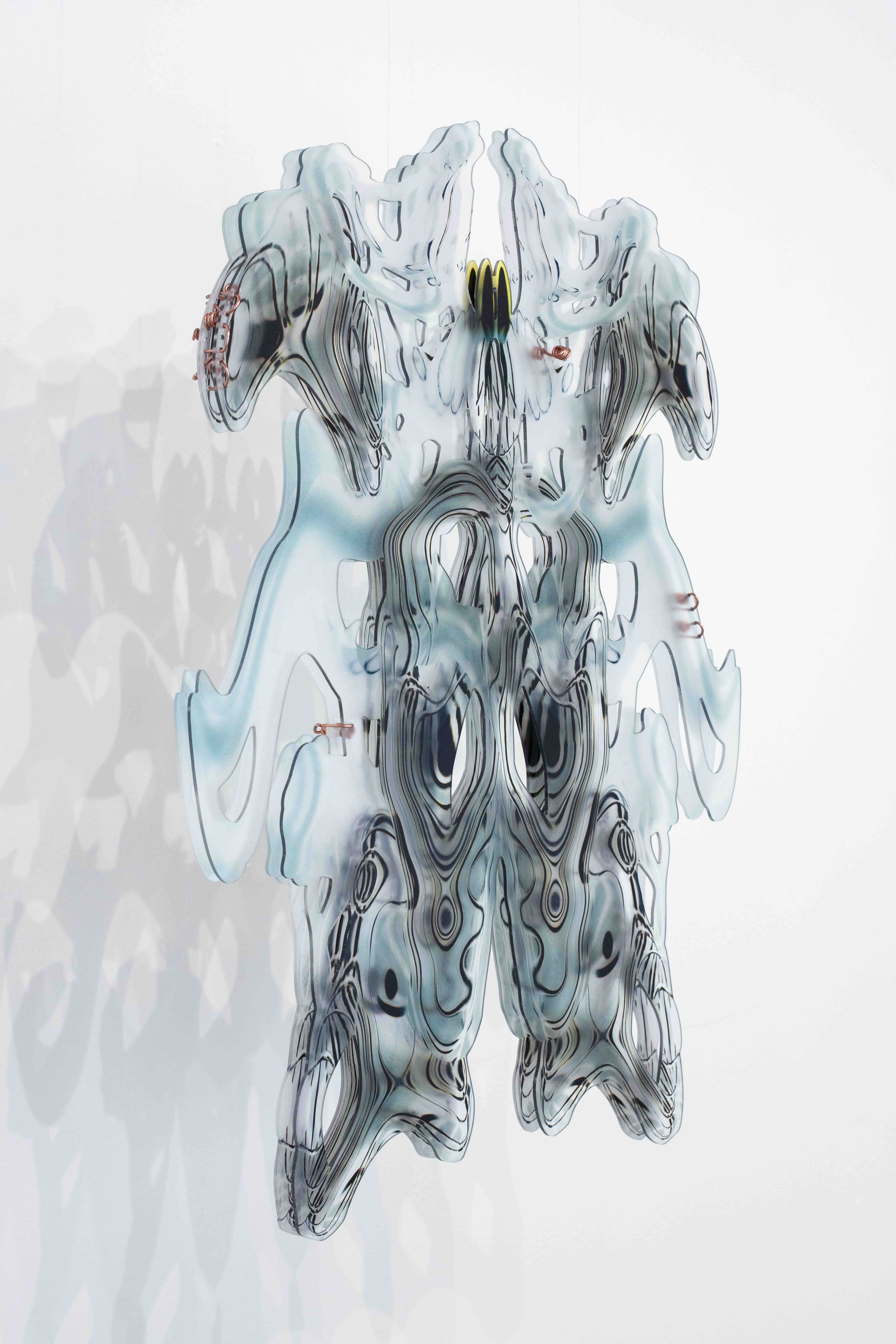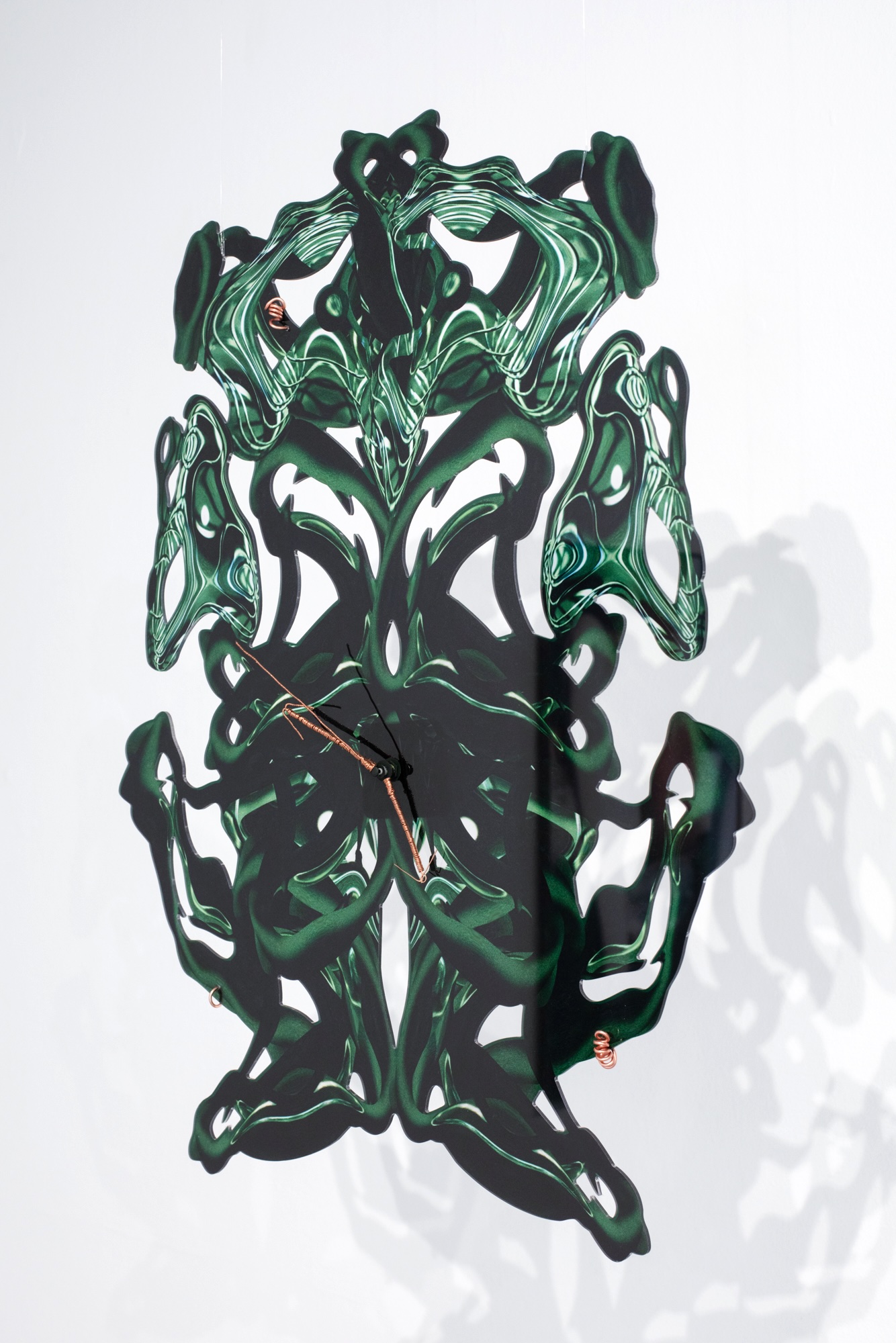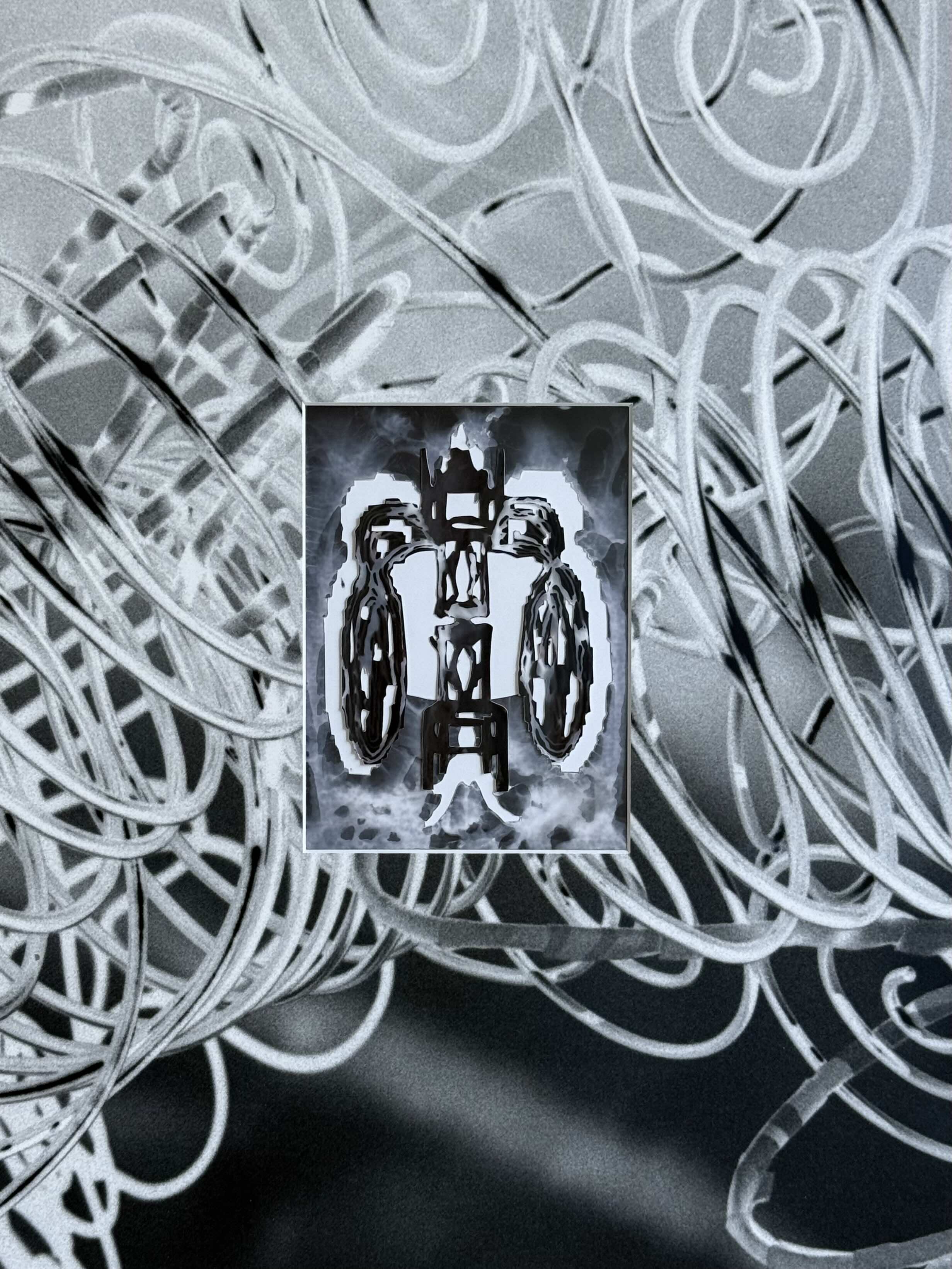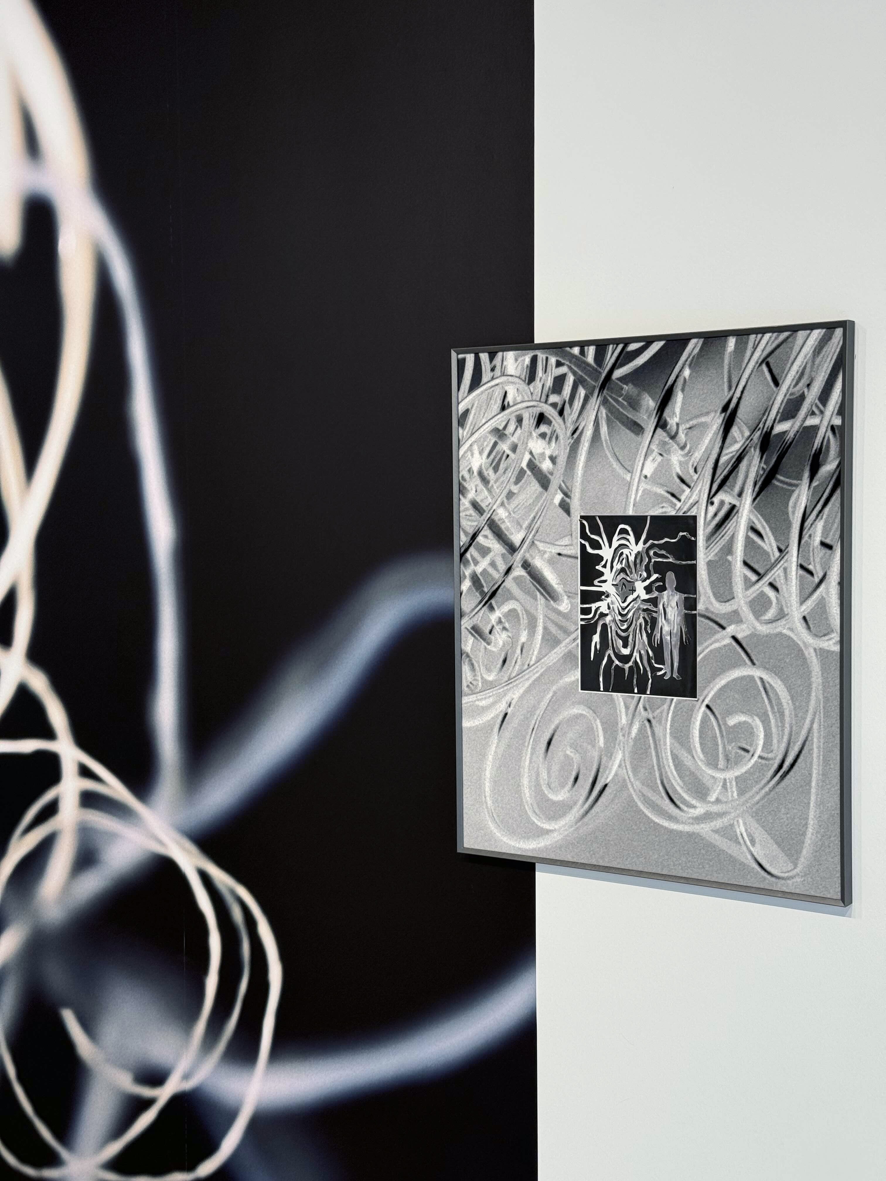 Central to the artwork is the use of chemigrams, created on photosensitive paper with a photo fixer and developer. Merging photography with drawing, she manipulates photosensitive paper both chemically and physically, scratching, folding, painting, and making marks to introduce another dimension of expression. Later, the images are printed on aluminium (dibond), giving the material a new layer of materiality. By bending the surface of the aluminium (dibond), the image, initially constrained within a two-dimensional frame, begins to capture a three-dimensional world. This experimental photographic technique, akin to a carefully executed magic trick, captures images without a camera. In this process, the power of photography is found not only in the final product but in the intricate and multifaceted creation process itself.