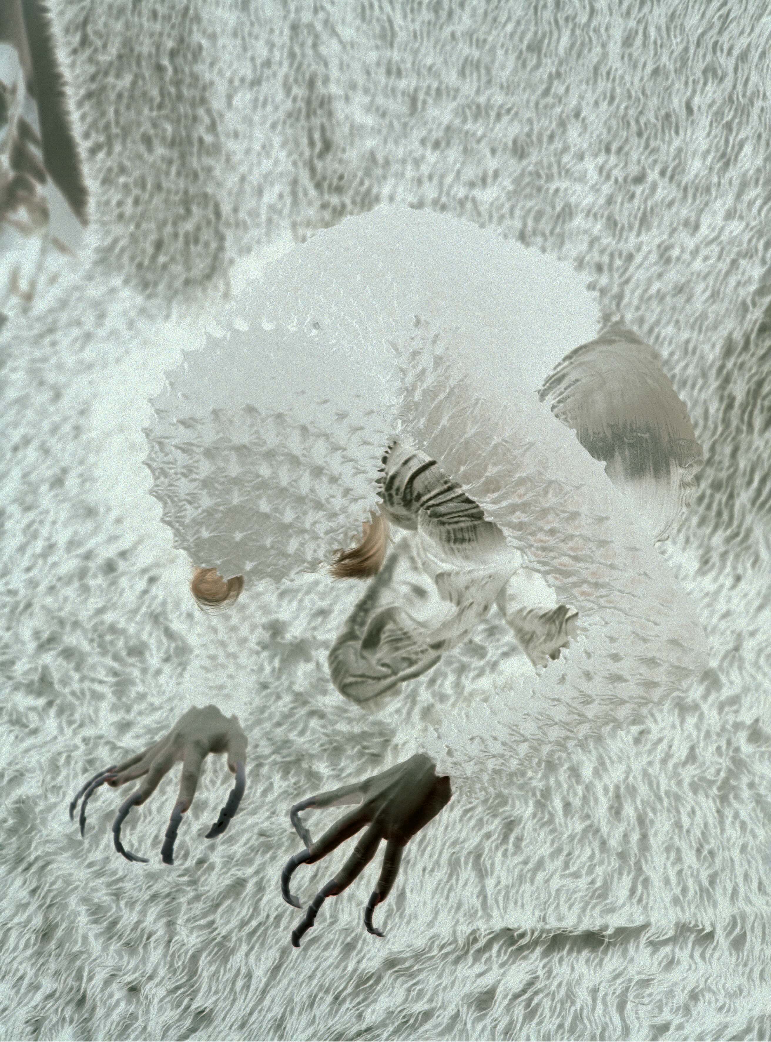 Photography, as a "haunted medium," plays a central role in her work, preserving traces of the past while shaping imagined futures. Through analogue and experimental techniques such as chemigrams, she investigates the materiality of the photographic image. From self-portraits to staged compositions, her process is deeply hands-on, involving set construction, object-making, and direct engagement with physical materials.