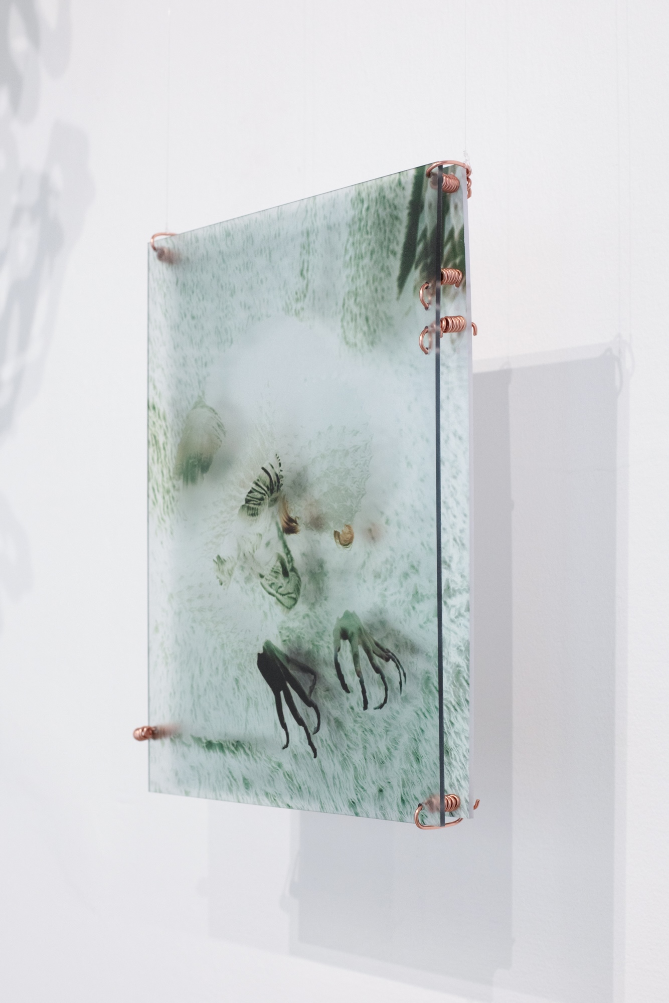 a spiritual amplifier and a technological powerhouse. Spirits were once viewed as ethereal beings linked to places or emotions, manifesting through strange phenomena. Today, the concept of ghosts has evolved from restless souls into energy-based entities that resonate with the language of technology - electromagnetic waves, data streams, electronic voice phenomena (EVP), artificial intelligence algorithms and other contemporary media. The quartz crystal becomes a symbolic bridge to such a transformation. From meditation to microchips, quartz continues to shape how we connect, whether through cosmic energy or Wi-Fi signals. During World War II, women worked in quartz factories, cutting and tuning crystals for communication devices, shaping tools that would carry voices across battlefields. Today, these same stones, polished for healing or placed on altars, embody a strange duality: sacred and scientific, personal and political. For Agate Tūna, process is essential, a curious dialogue with materiality and observations of its changes - perhaps this is why she has chosen analogue photography as her main means of expression. Using mirrors, glass, copper wire and scanning, Agate subjects her primary material (raw film) to various multimedia manipulations and interprets the photographic image into plexiglass objects and chemigrams. In addition, spatial extensions of photography enter the gallery as an autonomous affirmation. Furniture, wallpaper, electricity and corporeal symbols captured in pictures of the body are analogous entities that reflect and challenge the digital. At the same time, it is a play with the home as a conceptual place of domesticity and creation, an allegorical electromagnetic field that affects the human (artist’s) body, mind and spirit in everyday life.